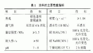 另外,涂料在聚合干燥前的分子較小,與體系中的高效滲透劑協(xié)同,可滲透進混凝土深達5mm,將砼體面層的毛細孔、微裂縫等填充密實,同時與砼面形成整體封閉保護層,隔絕有害物質侵入,而實現(xiàn)長久的保護作用。該涂料經(jīng)檢測符合國家飲用水使用標準。應用于三峽閘門導流洞、小浪底水庫、裕東電廠水塔、洛陽熱電水塔等,評價良好。涂料的主要性能指標參數(shù)見表1.