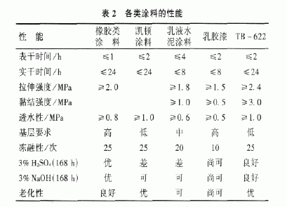 為解決舊水塔外表面的防護問題,目前常用的品種有:巴代膠、氯磺化聚乙烯涂料、凱頓涂料、乳液水泥防水涂料、外墻乳膠漆等。各類涂料的性能見表2。