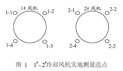 1) 選擇振動值測量點。按圖在兩座風機附近布置振動監測點,如圖1。