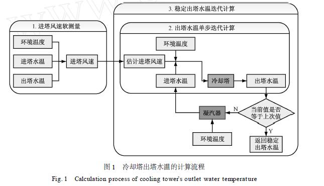 凝汽器真空是電廠運(yùn)行人員的主要監(jiān)視參數(shù).凝汽器真空提高時(shí),機(jī)組出力增加[ 1 ] ;而循環(huán)水泵的運(yùn)行方式對(duì)凝汽器真空及廠用電率等指標(biāo)影響較大,因此研究在一定環(huán)境和汽輪機(jī)負(fù)荷條件下循環(huán)水泵的最優(yōu)運(yùn)行方式、進(jìn)而確定循環(huán)水泵的合理運(yùn)行臺(tái)數(shù)、保證凝汽器在最佳真空下工作,是提高電廠運(yùn)行經(jīng)濟(jì)性的重要措施. 冷卻塔作為實(shí)現(xiàn)低溫放熱的最終設(shè)備,是保證排汽壓力穩(wěn)定的重要環(huán)節(jié);通常通過冷卻塔出塔水溫(即循環(huán)水入口溫度) 的變化來影響凝汽器壓力,進(jìn)而影響冷端系統(tǒng)的經(jīng)濟(jì)性[ 2 ] . 因此,計(jì)算循環(huán)水泵在不同運(yùn)行方式下的冷卻塔出塔水溫是確定循環(huán)水泵最優(yōu)運(yùn)行方式的關(guān)鍵. 自然通風(fēng)逆流濕式冷卻塔廣泛用于電站凝汽器循環(huán)水的冷卻,其冷卻特性直接影響電站冷端系統(tǒng)的安全、經(jīng)濟(jì)及高效運(yùn)行[ 3 ] . 它主要依靠塔內(nèi)外的空氣密度差形成自然抽力進(jìn)行工作,因此進(jìn)塔風(fēng)速是決定冷卻塔換熱性能的一個(gè)重要參數(shù),可以通過冷卻塔的空氣動(dòng)力計(jì)算[425 ] 得到. 但由于塔內(nèi)的阻力計(jì)算過程復(fù)雜,需要進(jìn)行多組試驗(yàn)才能確定阻力系數(shù),因此該方法實(shí)用性差且不準(zhǔn)確. 針對(duì)此缺點(diǎn),本文提出了一種基于冷卻塔熱力計(jì)算的冷卻塔進(jìn)塔風(fēng)速軟測(cè)量方法,并據(jù)此估算出循環(huán)水泵在其他運(yùn)行方式時(shí)的進(jìn)塔風(fēng)速,為確定循環(huán)水泵在不同運(yùn)行方式下的冷卻塔出塔水溫提供參考.文獻(xiàn)[629 ]在確定循環(huán)水泵運(yùn)行方式時(shí),都是在假定循環(huán)水入口溫度相等的前提下進(jìn)行的. 但對(duì)于目前多數(shù)電廠采用的閉式循環(huán)水系統(tǒng),冷卻塔的冷卻效果直接決定了冷卻塔的出塔水溫,即循環(huán)水入口溫度在循環(huán)水泵不同運(yùn)行方式下相差較大. 所以,不考慮冷卻塔因素而直接在循環(huán)水入口溫度相等的前提下確定循環(huán)水泵的最優(yōu)運(yùn)行方式顯然是不合理的. 因此,本文提出在相同的環(huán)境條件下根據(jù)當(dāng)前循環(huán)水泵的運(yùn)行方式來估算其他循環(huán)水泵運(yùn)行方式下的冷卻塔出塔水溫,以確定循環(huán)水泵的最優(yōu)運(yùn)行方式,這對(duì)現(xiàn)場(chǎng)中冷端系統(tǒng)的優(yōu)化具有較強(qiáng)的現(xiàn)實(shí)意義.本文以工程中普遍采用的麥克爾焓差法為基礎(chǔ),對(duì)冷卻塔進(jìn)行了熱力計(jì)算. 首先,根據(jù)當(dāng)前實(shí)時(shí)的進(jìn)出塔水溫計(jì)算出當(dāng)前的進(jìn)塔風(fēng)速,然后估算出循環(huán)水泵運(yùn)行方式改變后的進(jìn)塔風(fēng)速,再以環(huán)境溫度為初始的循環(huán)水入口溫度,計(jì)算出此時(shí)的進(jìn)塔水溫和出塔水溫,并通過循環(huán)計(jì)算直至滿足計(jì)算出的出塔水溫穩(wěn)定. 圖1 為冷卻塔出塔水溫的計(jì)算流程,由此確定出循環(huán)水泵在不同運(yùn)行方式下的出塔水溫,可直接用于循環(huán)水泵最優(yōu)運(yùn)行方式的計(jì)算.