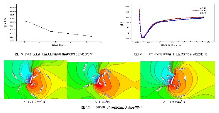 在微分方程離散的過程中,不可避免的會(huì)引入離散誤差,對(duì)于同一離散格式,網(wǎng)格越密,離散誤差通常會(huì)越小[8]。由于計(jì)算機(jī)資源的限制,我們不可能將網(wǎng)格劃分的很細(xì),但需要保證數(shù)值求解結(jié)果是網(wǎng)格獨(dú)立的解。本文共采用了三套網(wǎng)格系統(tǒng),相鄰的兩個(gè)網(wǎng)格系統(tǒng)的疏密程度變化足夠大,計(jì)算了風(fēng)機(jī)出口的全壓和沿程的壓力,所得的結(jié)果如圖5 和圖6 所示。由圖5 可以看出,采用三種網(wǎng)格計(jì)算的風(fēng)機(jī)出口全壓差別不大。圖6 表明沿程的壓力有所不同,但30 萬與46 萬兩種密度的網(wǎng)格的計(jì)算值相近,相差很小。因此我們認(rèn)為30萬網(wǎng)格已經(jīng)可以滿足計(jì)算精度的要求,可以獲得與網(wǎng)格無關(guān)的解。冷卻塔軸流風(fēng)機(jī)三維流場(chǎng) 數(shù)值模擬與影響因素分析