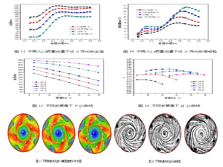2.4 葉片安裝角對(duì)風(fēng)機(jī)性能的影響圖15 所示為不同葉片安裝角度時(shí)的P-Q 性能曲線,從圖中可以看出,調(diào)整葉片的安裝角度可以影響風(fēng)機(jī)的性能曲線。在所計(jì)算的安裝角度范圍內(nèi),安裝角越大,相同流量下風(fēng)機(jī)出口的全壓值也就越大。當(dāng)安裝角較小時(shí),P-Q 性能