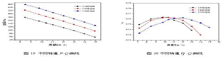 圖19 為不同電機(jī)轉(zhuǎn)速時(shí)的P-Q 曲線,從圖中可以看出,轉(zhuǎn)速的改變會(huì)引起風(fēng)機(jī)性能曲線的變化。三種轉(zhuǎn)速下,風(fēng)機(jī)的P-Q 曲線變化趨勢(shì)是相同的,相同流量下,電機(jī)轉(zhuǎn)速越大,出口全壓的值也隨之增加。這主要是因?yàn)椋D(zhuǎn)速增加,輸入功率變大,單位時(shí)間對(duì)流體介質(zhì)所作的功也就越多,但出口風(fēng)壓的增加并不一定意味著風(fēng)機(jī)的效率也同樣增大,從圖20 不同轉(zhuǎn)速下風(fēng)機(jī)的η -Q 曲線可以看出,在風(fēng)機(jī)的入口流量較小時(shí),風(fēng)機(jī)轉(zhuǎn)速的提高反而會(huì)使風(fēng)機(jī)的效率下降,這是因?yàn)榱髁枯^小時(shí),單位時(shí)間流過的流體質(zhì)量更少,轉(zhuǎn)速