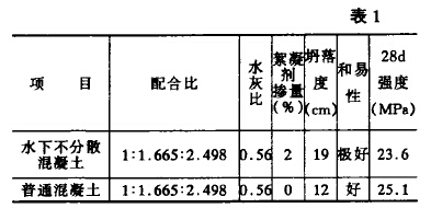 a.相同配合比、水灰比條件下,普通混凝土與水下不分散混凝土有關性能及強度情況如表1。