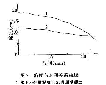 c.試驗表明水下不分散混凝土陷度損失快,陷度與時間有如下關系見圖3。