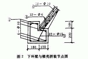下半球設(shè)一道下環(huán)梁,該梁預(yù)留筋和下半球連成整體。圖2為下環(huán)梁與錐殼拼裝節(jié)點(diǎn)圖。水塔支筒運(yùn)用滑模工藝,水柜地面拼裝預(yù)制,然后整體吊裝高空就位。
