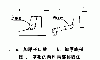1.強度降低的處理當基礎鹼強度降低但不低于規范要求的C13(或在其附近)時,可采用加厚底板外挑部分或加厚杯口壁厚的辦法來處理見圖1。