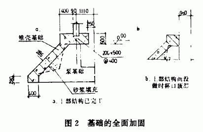 則需用砂漿將其充填。最困難的是怎么將上部結構荷重,由傳給老基礎轉為傳給新基礎,為此在錐殼頂部做了1個支承平臺,該平臺,采用18根