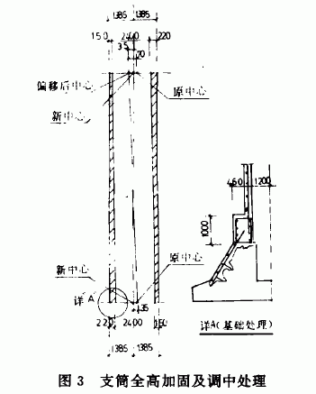偏移后中心線講,調正后中線在反向各偏35mm,加固支筒采用比原支筒高一號的鹼,并在原支筒作表面處理后施工,加固筒身中配鋼筋網。為