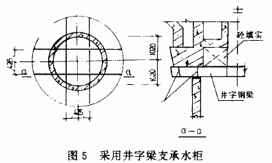 構造來承托上部水柜荷重。根據過去的經驗,我們采用了用4根工字鋼互相組成井字梁系,梁支承在支筒壁上用其8個外挑端來承受水柜重,見