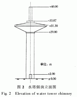 該水塔煙囪全高40m,如圖2所示。其中下部水塔支筒部分高29m,外徑3·2m,壁厚18cm,單層鋼筋網布置在筒壁的中心,中部倒錐形水箱高4m外徑12m,水箱體壁厚8cm。上部煙囪部分高7m外徑1·3m,壁厚15cm。在水塔支筒內有一厚度為10cm的鋼筋混凝土隔板墻,將支筒內腔分為南北兩部分,北側有上下水管道、配電箱、金屬梯和平臺等南側為煙道,支筒南側有一進煙道洞口,高2·0m、寬1·5m,支筒北側有一專供人員出入的洞口,高