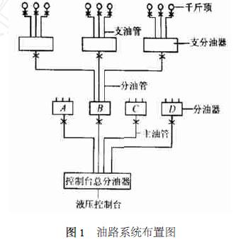 油路系統是連接控制臺到千斤頂的液壓通路, 主要由油管、管接頭、液壓分配器和截止閥等元、器件組成。油管采用高壓橡膠管, 主油管內徑為18mm , 分油管內徑14mm; 油路的布置采用分級方式, 即: 從液壓控制臺通過主油管到分油器, 從分油器經分油管到支分油器, 從支分油器經膠管到千斤頂(如圖1) 。主油管、分油管、支油管的長度應分別盡量相近。500t 水塔倒錐殼水箱整體頂升施工技術