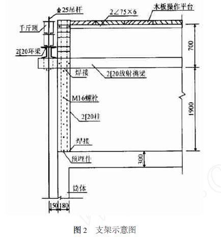 提升支架設置在鋼筋混凝土筒身頂端, 由槽鋼支柱、槽鋼挑梁、槽鋼環梁、角鋼支撐、鋼板等焊接而成。筒身滑模施工所用的滑模提升鋼管支架(以下簡稱支架) 在筒身施工完畢后不予拆除, 槽鋼支柱、槽鋼挑梁等與支柱鋼管組合安裝, 每兩根槽鋼與對應的支架鋼管對夾, 螺栓連接, 所有槽鋼均使用普通槽鋼。支架上鋪木板組成操作平臺(如圖2) 。