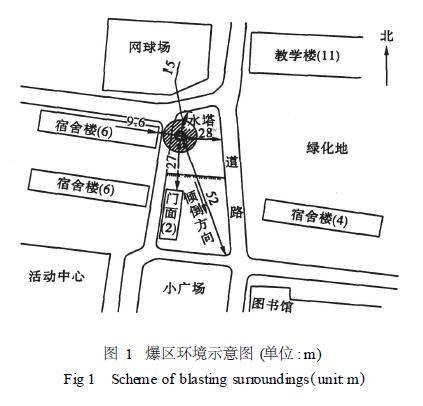 某單位因改為無塔供水,其院內原供水的水塔廢棄,其場地已規劃修建1棟宿舍樓,需將其進行拆除。水塔東側28 m處是校園道路, 55 m處是宿舍樓;東南側為拆除房屋后的空曠場地,南側15 m處是道擋土墻,高差2 m, 27 m處是2層門面,西側2 m處是道路, 9. 6 m處是宿舍樓;北側15 m處是圍欄和道路;另水塔四周有花草、樹木、假山、雕塑等,周圍無地下管道和地面架空電纜。見圖1環境示意圖。