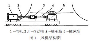 風(fēng)機(jī)組成主要包括電機(jī)、2 根浮動(dòng)軸、軸承箱、齒輪減速箱、葉片。