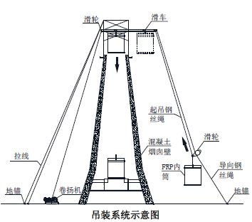 本法利用在煙囪頂部安裝的起吊架及滑輪,在地面安裝卷揚機,通過鋼絲繩的拉力實現(xiàn)提升內(nèi)筒,逐節(jié)組合連接安裝的方法。以頂部起吊架為受力結(jié)構(gòu),以地面卷揚機為動力,以鋼絲繩為紐帶,按從下到上的順序,依次將制作好的內(nèi)筒吊裝就位,對接、調(diào)整、內(nèi)部手糊、灌縫,如此循環(huán)往復,直到210m 內(nèi)筒組合安裝完成。