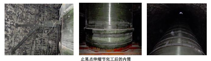 3.5 19m 支撐平臺以下連接段FRP 施工19m 鋼平臺以上FRP 內(nèi)筒及下部水平鋼煙道施工完成后,再做最后一節(jié)FRP 內(nèi)筒連接段,將水平煙道與19m 以上FRP 內(nèi)筒連通。連接段長5.55m,壁厚10mm,在鋼煙道出口以上800mm 處設[型伸縮節(jié),伸縮部位向外凸出,高度和寬度均為200mm,手糊玻璃纖維布制成。連接段FRP 筒需從已經(jīng)安裝好的FRP 內(nèi)筒中吊下,因此,需將內(nèi)筒軸向切縫一道,筒壁錯位后縮小其直徑。吊運到預定位置后,在內(nèi)筒外壁四個方向手糊吊耳,吊耳完全固化后,利用19m 鋼平臺上的鋼梁將內(nèi)筒懸吊就位,將筒壁豎向切縫一側(cè)切掉一部分,再將筒壁對位恢復,切縫位置兩面進行打磨處理后,延縫隙手糊寬400mm 厚10mm 玻璃纖維布將內(nèi)筒恢復成整體。上部與鋼平臺以上第一節(jié)內(nèi)筒搭接500mm,接縫部位手糊厚度150mm 玻璃纖維布,每側(cè)寬度240mm;下部與鋼煙道出口對接,在接縫內(nèi)外兩面手糊玻璃絲布固結(jié)密封,手糊寬度每側(cè)200mm,厚度10mm。接縫部位為薄弱部位,手糊前將接縫部位FRP 內(nèi)筒和煙道鋼板進行表面除塵、除銹處理,分層粘接成活,各層間相互錯縫搭接,上一層壓住下一層的接縫位置,確保接縫嚴密。止晃點伸縮節(jié)完工后的內(nèi)筒