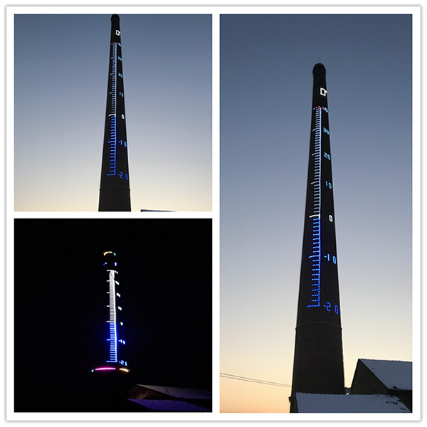 記者了解到,這座由廢舊窯廠煙囪亮化改造而成的煙囪溫度計確實名不虛傳,它變廢為寶、環(huán)保、實用、美觀的理念深入人心,設計師沈大亞通過在煙囪±13處往上安裝兩面點光源溫度計,來顯示實時空氣溫度,在煙囪頂口往下14米處往上安裝兩面顯示溫度數(shù)字,燈光溫度顯示氣象局預報溫度,而且煙囪溫度計里面有溫度感應器通過程序轉換,用燈光成像的方法顯示到煙囪燈光帶上的。沈大亞根據(jù)了浙江省金華市磐安縣尖山鎮(zhèn)歷史最高和最低溫度,而把溫度刻度最高定到40℃、最低定到20℃。