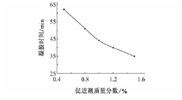 凝膠時間與纏繞工藝、纖維浸潤、產(chǎn)品質(zhì)量關(guān)系密切, 本工作對凝膠時間和各種助劑的配比進(jìn)行了優(yōu)化和篩選, 按照GB/T 7193-2008《不飽和聚酯樹脂25℃凝膠時間測定方法》測試了凝膠時間, 重點研究了室溫下固化劑含量為1.5% (質(zhì)量分?jǐn)?shù), 下同) 時, 促進(jìn)劑含量與凝膠時間的關(guān)系。