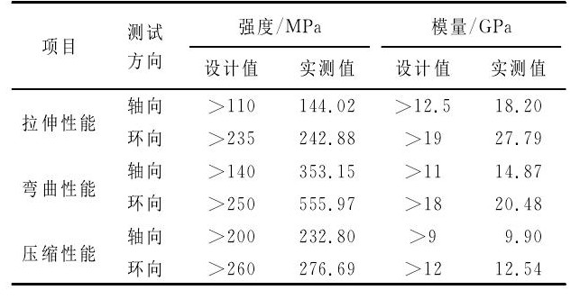 典型鋪層結(jié)構(gòu)的元件級試驗數(shù)據(jù)對最終產(chǎn)品鋪層結(jié)構(gòu)設(shè)計起著重要作用。通過典型方向受力形式的試驗進(jìn)行驗證, 結(jié)果表明:其軸向和環(huán)向的拉伸強度分別為352 MPa和21 MPa;其軸向和環(huán)向的拉伸模量分別為35.28GPa和1.90GPa;其拉剪強度為13.86MPa。這表明鋪層結(jié)構(gòu)的力學(xué)性能滿足國內(nèi)外現(xiàn)行標(biāo)準(zhǔn)要求[3-10]。